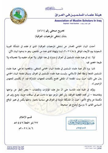 أصدر قسم الإعلام في هيئة علماء المسلمين في العراق، بيانا نفى فيه مشاركة الهيئة في ملتقى المرجعيات العراقية الذي تم عقده في المملكة العربية السعودية.