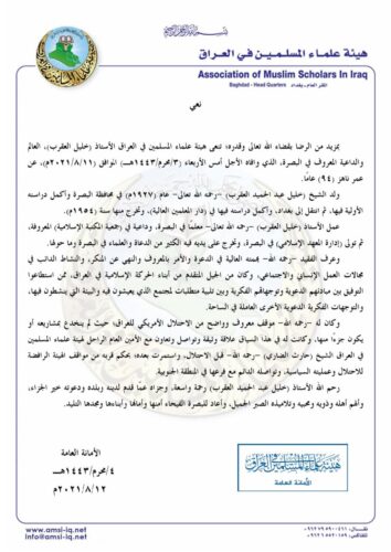 نعت هيئة علماء المسلمين في العراق، الأستاذ خليل العقرب، العالم والداعية المعروف في البصرة، الذي وافاه الأجل عن عمر ناهز 94 عامًا.