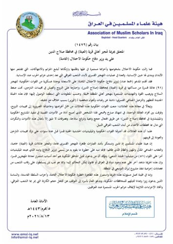هيئة علماء المسلمين في العراق: ما تزال حكومة الاحتلال مستمرة في غيها وممعنة في عمليات التهجير القسري للعراقيين