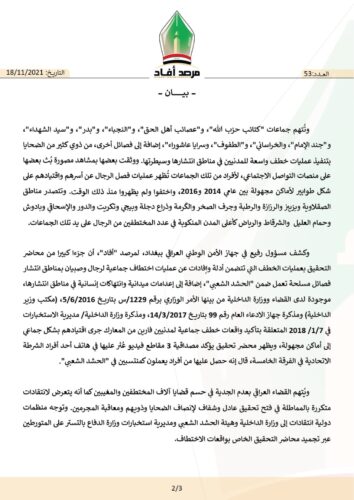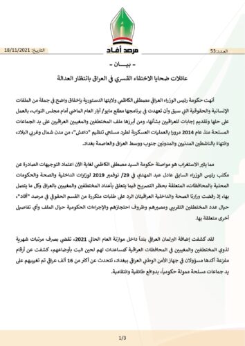 قال مرصد أفاد الحقوقي إن حكومة الكاظمي أنهت ولايتها بإخفاق واضح في ملف المختطفين والمغيبين على يد الميليشيات في العراق منذ انطلاق العمليات العسكرية عام 2014 وانتهاءًا بالناشطين المدنيين والمدونين