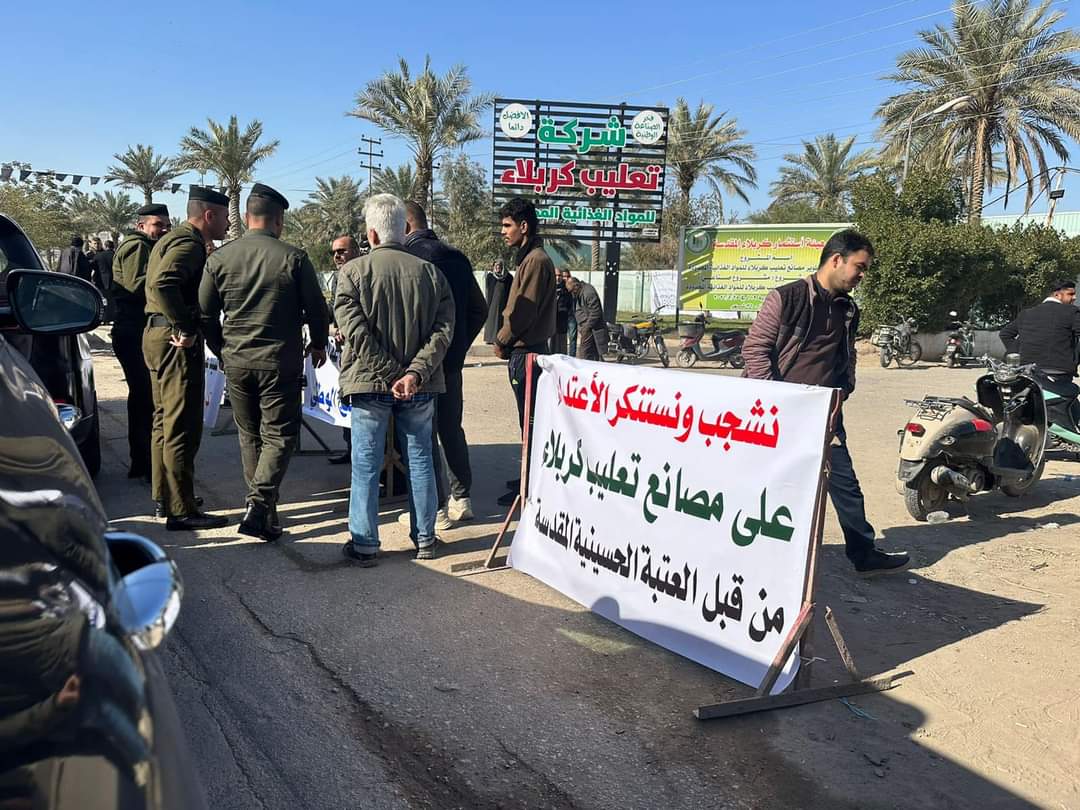 وأظهرت صور لموظفي معمل تعليب كربلاء وهم يحتجون على ما وصفوه باستيلاء عناصر من العتبة الحسينية على أراضي المعمل، مطالبين الجهات المعنية بالتدخل.