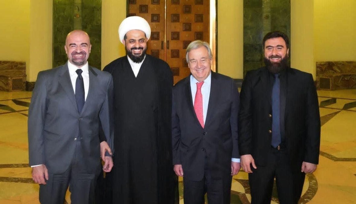 وظهر الأمين العام غوتيريش في صورة تداولها ناشطون عراقيون وعرب وإلى يمينه زعيم ميليشيا العصائب قيس الخزعلي وإلى يساره قائد ميليشيا بابليون ريان الكلداني، وكلا الزعيمين على لوائح الإرهاب بتهم انتهاك حقوق الإنسان وقتل المدنيين على الهوية، بالإضافة إلى الفساد وتجارة المخدرات.