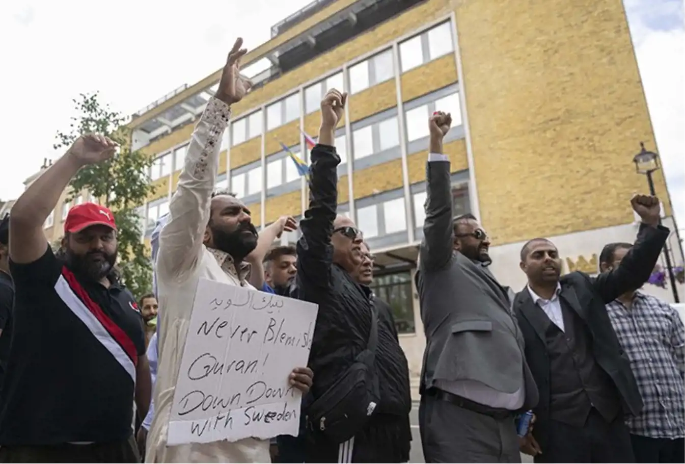 وخلال المظاهرة قام بعض المحتجين بحرق علم السويد أمام مبنى السفارة، فيما قام بعضهم برفع العلم الفلسطيني قبالة السفارة فيما اتخذت الشرطة البريطانية إجراءات أمنية أمام السفارة خلال احتجاج المتظاهرين.