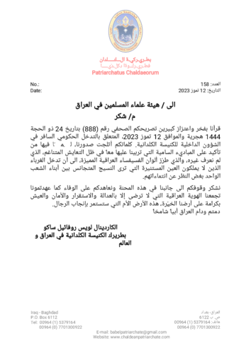 وجاء في رسالة الكاردينال لويس روفائيل ساكو إلى هيئة علماء المسلمين “قرأنا بفخر واعتزاز كبيرين تصريحكم الصحفي المتعلق بالتدخل الحكومي السافر في الشؤون الداخلية للكنيسة الكلدانية. كلماتكم أثلجت صدورنا لِما فيها من تأكيد على المبادئ السامية التي تربينا عليها معًا في ظل التعايش المتناغم، الذي لم نعرف غيره، والذي طرّز ألوان الفسيفساء العراقية المتميزة، إلى أن تدخل الغرباء الذين لا يملكون العين المستنيرة التي ترى النسيج المتجانس بين أبناء الشعب الواحد بغض النظر عن انتماءاتهم. نشكر وقوفكم إلى جانبنا في هذه المحنة ونعاهدكم على الوفاء كما عهدتمونا تجمعنا الهوية العراقية التي لا ترضى إلا بالعدالة والاستقرار والأمان والعيش بكرامة على أرضنا الخيّرة، هذه الأرض الأم التي ستستمر بإنجاب الرجال. دمتم ودام العراق أبيًا شامخًا”.