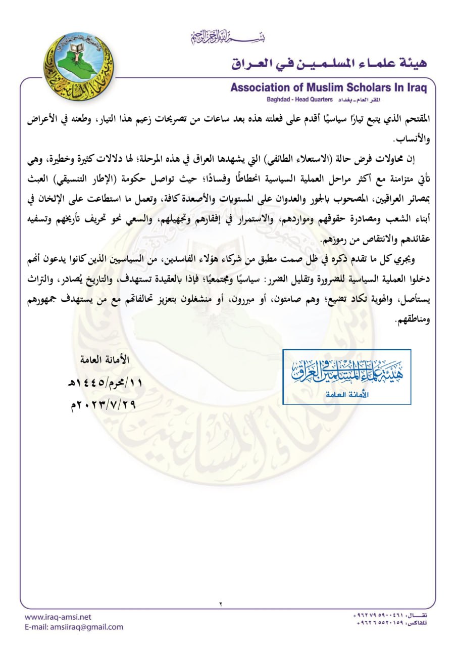وأوضحت الهيئة أن اقتحام المسجد هو تجاوز خطير سيفتح الباب على انتهاك حرمة المساجد وفرض الوصاية الدينية والفكرية عليهم , كما أن فرض حالة الاستعلاء الطائفي التي يشهدها العراق تأتي متزامنة مع أكثر مراحل العملية السياسية انحطاطًا وفسادًا.