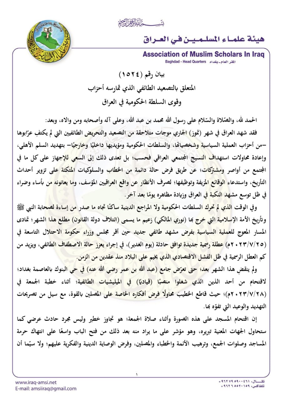 بغداد- قالت هيئة علماء المسلمين في العراق إن أحزاب العملية السياسية تُصعد وتحرض طائفيا وهو ما يهدد السلم الأهلي ضمن محاولات إعادة استهداف النسيج المجتمعي العراقي لصرف الأنظار عن واقع العراقيين المؤسف.
