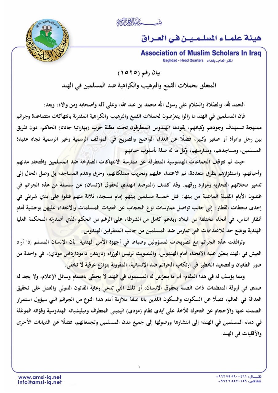 عمّان – أكدت هيئة علماء المسلمين في العراق أن المسلمين في الهند ما زالوا يتعرّضون لحملات القمع والترهيب والكراهية المقترنة بانتهاكات متصاعدة وجرائم ممنهجة تستهدف وجودهم وكيانهم، يقودها الهندوس المتطرفون تحت مظلة حزب (بهاراتيا جاناتا) الحاكم.
