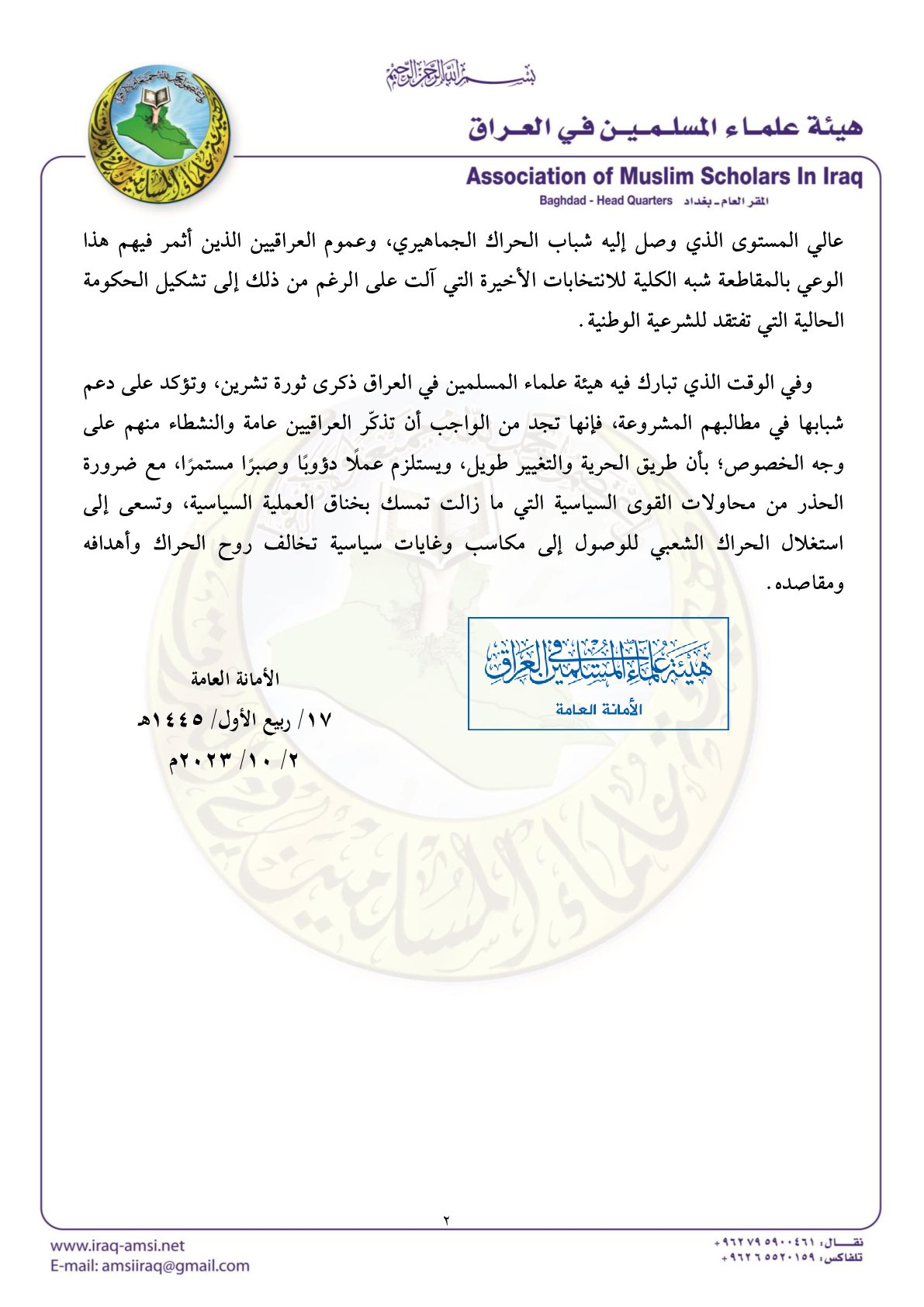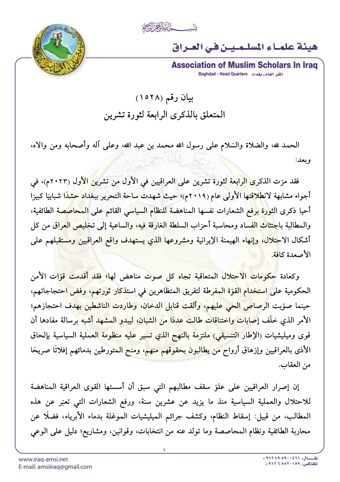 عمان- قالت هيئة علماء المسلمين في العراق إن الذكرى الرابعة لثورة تشرين على العراقيين، مرت في أجواء مشابهة لانطلاقتها الأولى عام 2019.