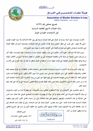 قسم الإعلام في هيئة علماء المسلمين في العراق: لجوء المتنافسين على انتخابات مجالس المحافظات إلى حالة الاستقطاب الطائفي بتصريحات النوّاب أو بتهديدات الميليشيات للمجتمع العراقي؛ يُنبئ عن مديات الفشل الكبير الذي هوى بمنظومة العملية السياسية.