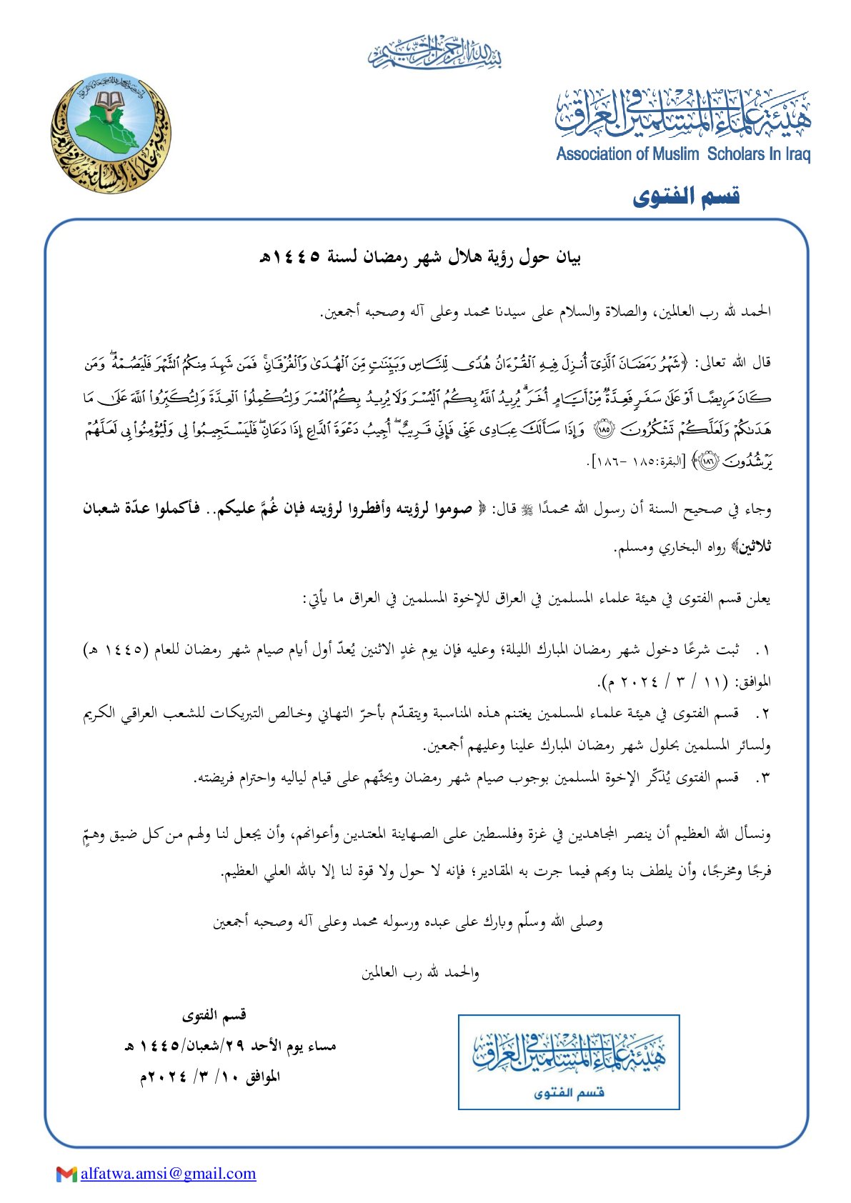 قسم الفتوى في هيئة علماء المسلمين في العراق يُعلن أن غدًا الاثنين هو أول أيام شهر رمضان المبارك