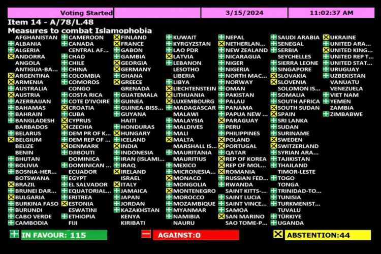 وكانت الجمعية العامة للأمم المتحدة، قد اعتمدت يوم الجمعة الماضي الخامس عشر من آذار، مشروع قرار قدمته باكستان نيابة عن منظمة التعاون الإسلامي بعنوان (تدابير مكافحة كراهية الإسلام)، بمناسبة اليوم الدولي لمكافحة كراهية الإسلام (الإسلاموفوبيا)؛ بعدما صوّتت لصالحه (115) دولة، في حين امتنعت غالب دول القارة الأوروبية عن التصويت، باستثناء الدول المسلمة فيها كتركيا، وألبانيا، والبوسنة والهرسك، وأذربيجان، وكازخستان، ودول أخرى كأيسلندا، والنرويج، ومقدونيا الشمالية، وصربيا.