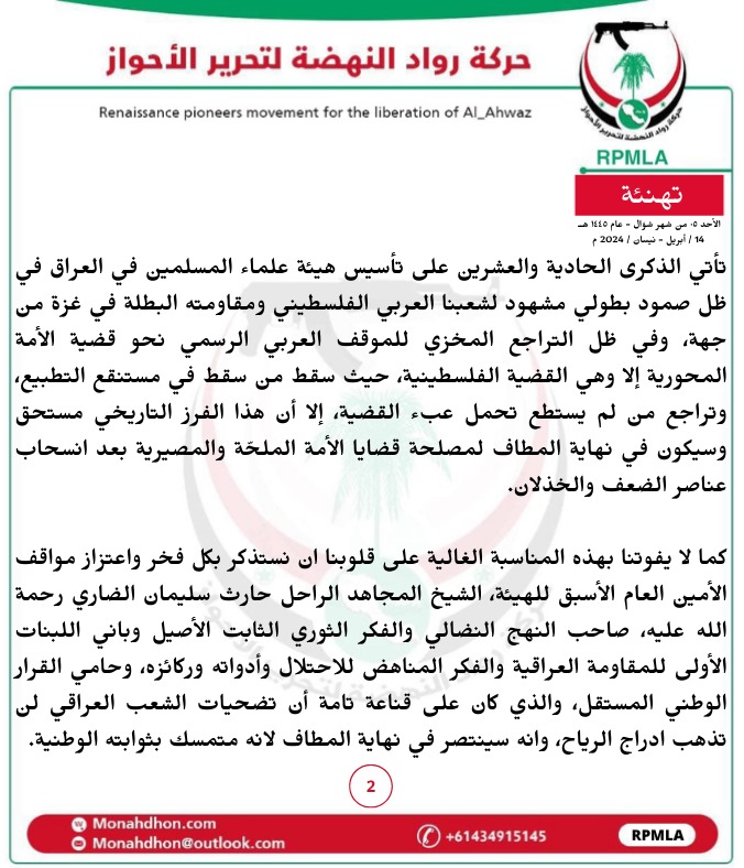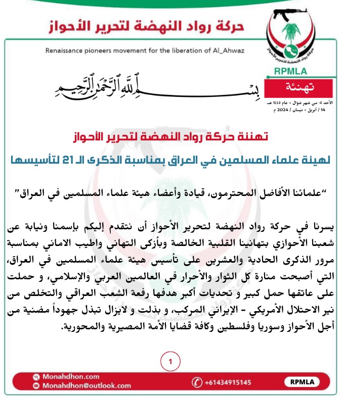 العراق – هنأت حركة رواد النهضة لتحرير الأحواز هيئة علماء المسلمين في العراق بمناسبة مرور الذكرى الحادية والعشرين على تأسيس الهيئة حيث إن الهيئة أصبحت منارة كل الثوار والأحرار في العالمين العربي والإسلامي،