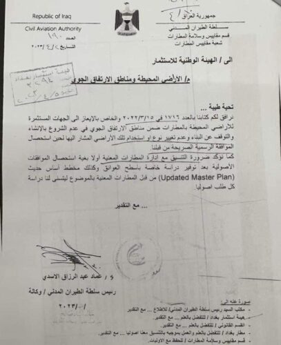 وحول المجمعات المشيدة بالقرب من مطار بغداد الدولي يُظهر كتاب رسمي موجه من سلطة الطيران المدني إلى هيئة الاستثمار يطالبها بالحد من هذه المجمعات كونها تخالف الضوابط، وتتسبب بمشاكل عديدة وتعيق حركة الإقلاع والهبوط من مدارج المطار، إلا أن الشركات المتنفذة لم تصغ لتلك المخاطبات واستمرت بإكمال البناء.