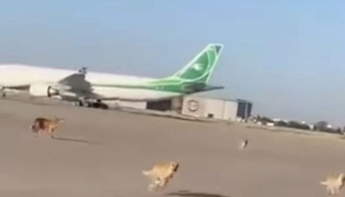 ويظهر المقطع كلابًا سائبة بعضها يلاحق ما يبدو وكأنها مركبة أرضية في المطار بالقرب من مدرج الطائرات، في حين تظهر أيضا مجموعة طائرات تابعة للخطوط الجوية العراقية.