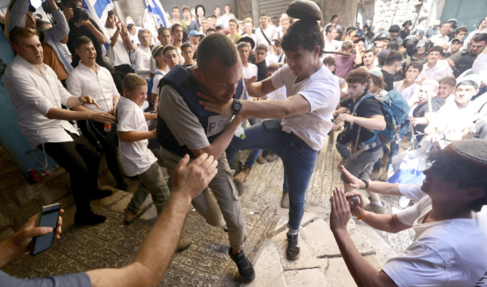 واعتدت مجموعات من المشاركين في المسيرة وهم يهتفون “الموت للعرب” على صحافيين، وفق ما افاد صحافيون في وكالة الصحافة الفرنسية.