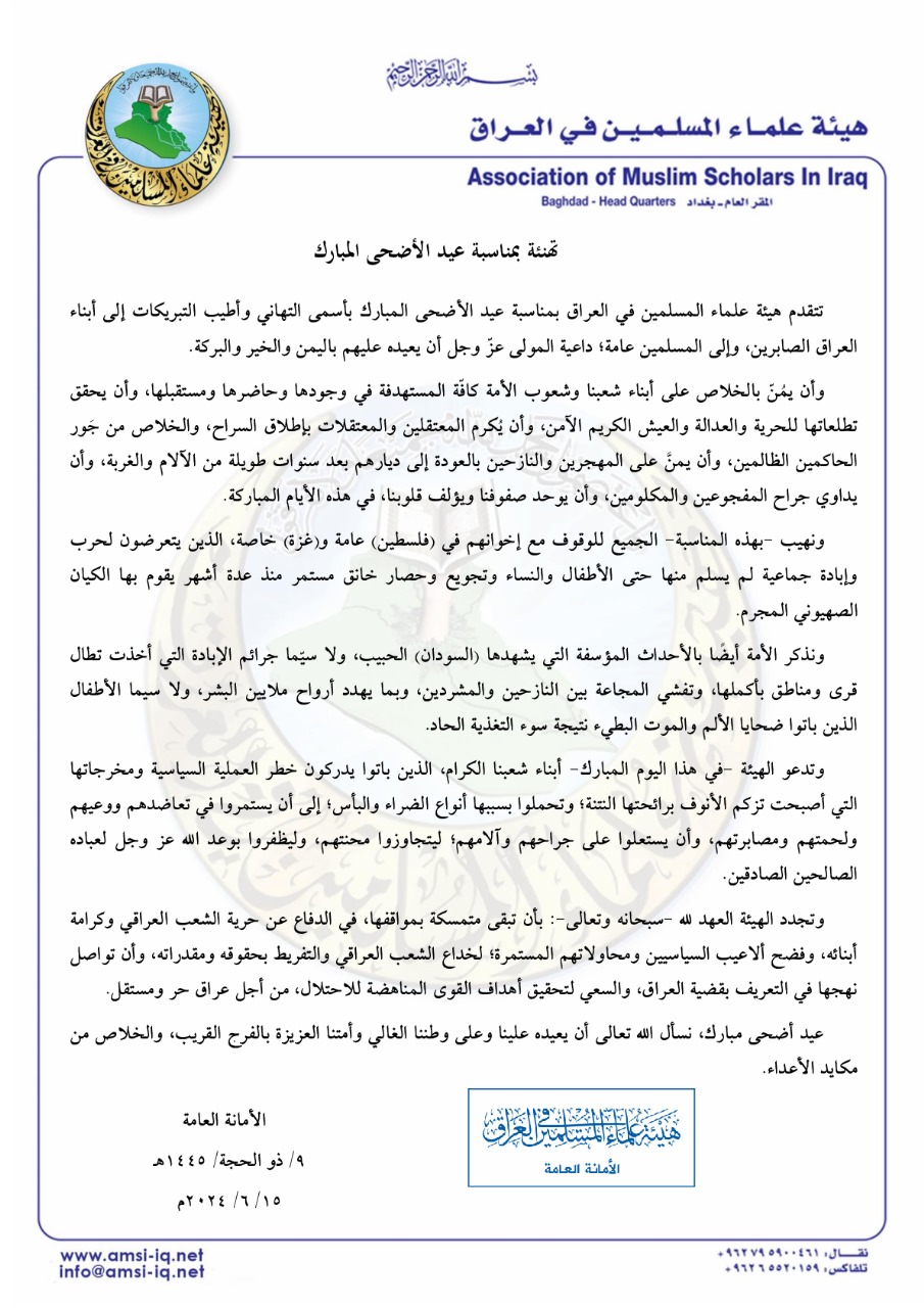 وتقدمت الأمانة العامة لهيئة علماء المسلمين بأسمى التهاني وأطيب التبريكات إلى أبناء العراق الصابرين، وإلى المسلمين عامة بالتهنئة بمناسبة عيد الأضحى.