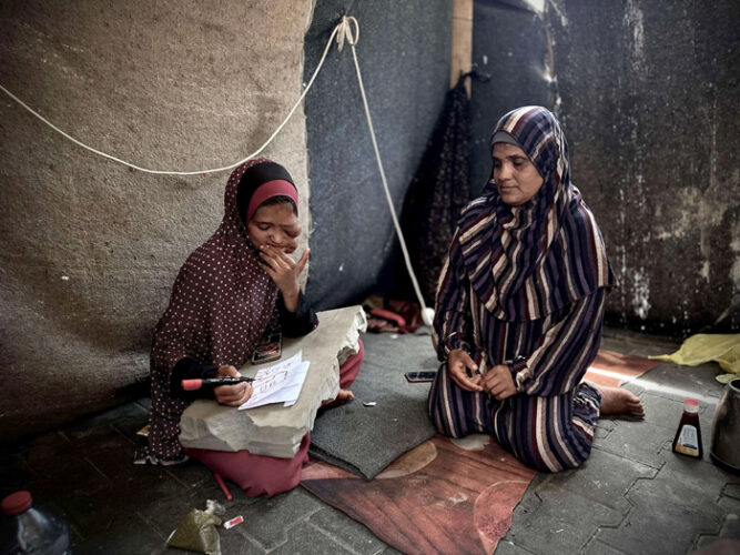 غزة- داخل خيمة من القماش، في أحد مراكز الإيواء وسط قطاع غزة، تجلس الفتاة انشراح أبو عمشة (16عاما)، المصابة بمرض السرطان، تقلب صورها التي اُلتقطت لها وهي على سرير العلاج الذي حرمت منه جراء الحرب المدمرة التي تشنها “إسرائيل” منذ السابع من تشرين الأول الماضي.