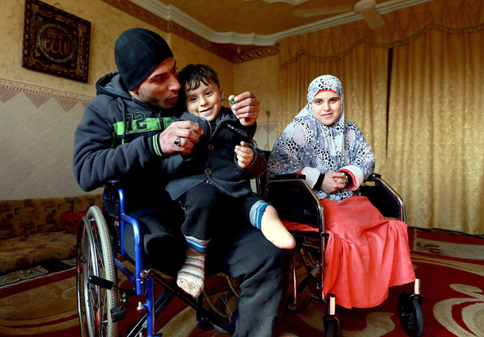 وفي القصف الإسرائيلي عام 2014 الذي فقد فيه الرجل الثلاثيني إحدى قدميه، فقدت زوجته كلتا قدميها، وفقد نجله أيضًا قدمه وإحدى عينيه، ما دفع أفراد العائلة إلى الاعتماد على الأجهزة المساندة والأطراف الصناعية لمواصلة حياتهم بشكل أسهل.