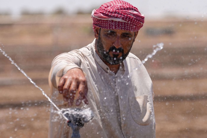 لم يتمكن الجوفي العام الماضي من زراعة أرضه تماماً بسبب شح المياه، لكنه اليوم يتنقل بين المرشات للتأكد من أنها تعمل بالشكل الصحيح غير آبه بالشمس الحارقة ودرجات الحرارة التي تلامس 50 درجة مئوية.