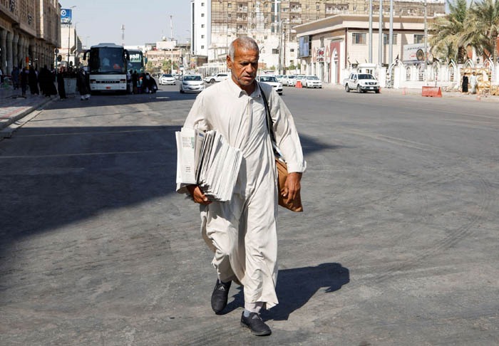 ومع اقتراب اليوم من نهايته في النجف، يعود بائع الصحف فاضل علي إلى منزله بخفي حنين إذ لا تزال حقيبة الصحف المطبوعة التي يحملها ويدور بها في أنحاء مدينة الكوفة ممتلئة.