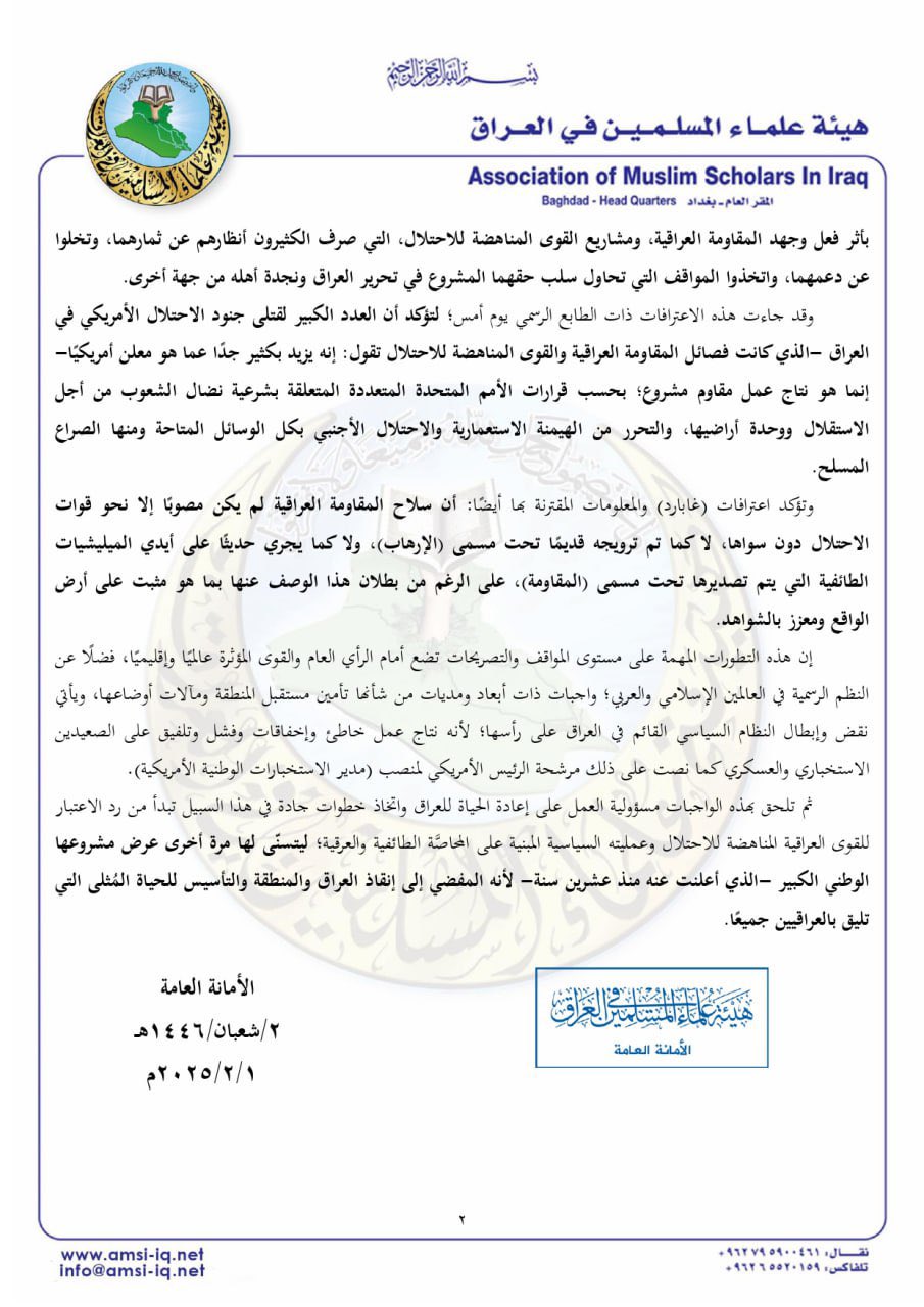وأضافت الهيئة في بيانها أن “هذه الواجبات ينبغي أن تلحق بها مسؤولية العمل على إعادة الحياة للعراق واتخاذ خطوات جادة في هذا السبيل تبدأ من رد الاعتبار للقوى العراقية المناهضة للاحتلال وعمليته السياسية المبنية على المحاصَّة الطائفية والعرقية؛ ليتسنّى لها مرة أخرى عرض مشروعها الوطني الكبير -الذي أعلنت عنه منذ عشرين سنة- لأنه المفضي إلى إنقاذ العراق والمنطقة والتأسيس للحياة المُثلى التي تليق بالعراقيين جميعًا”.