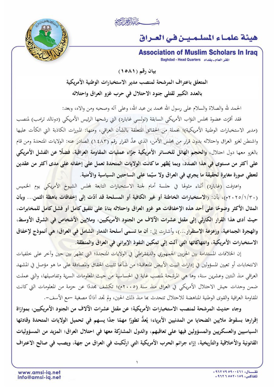 هيئة علماء المسلمين: اعترافات المرشحة لإدارة الاستخبارات الأمريكية تولسي غابارد المتعلقة بغزو واحتلال العراق تطور مهم جدًا يسهم في تحميل الولايات المتحدة وقادتها المزيد من المسؤوليات القانونية والأخلاقية.
