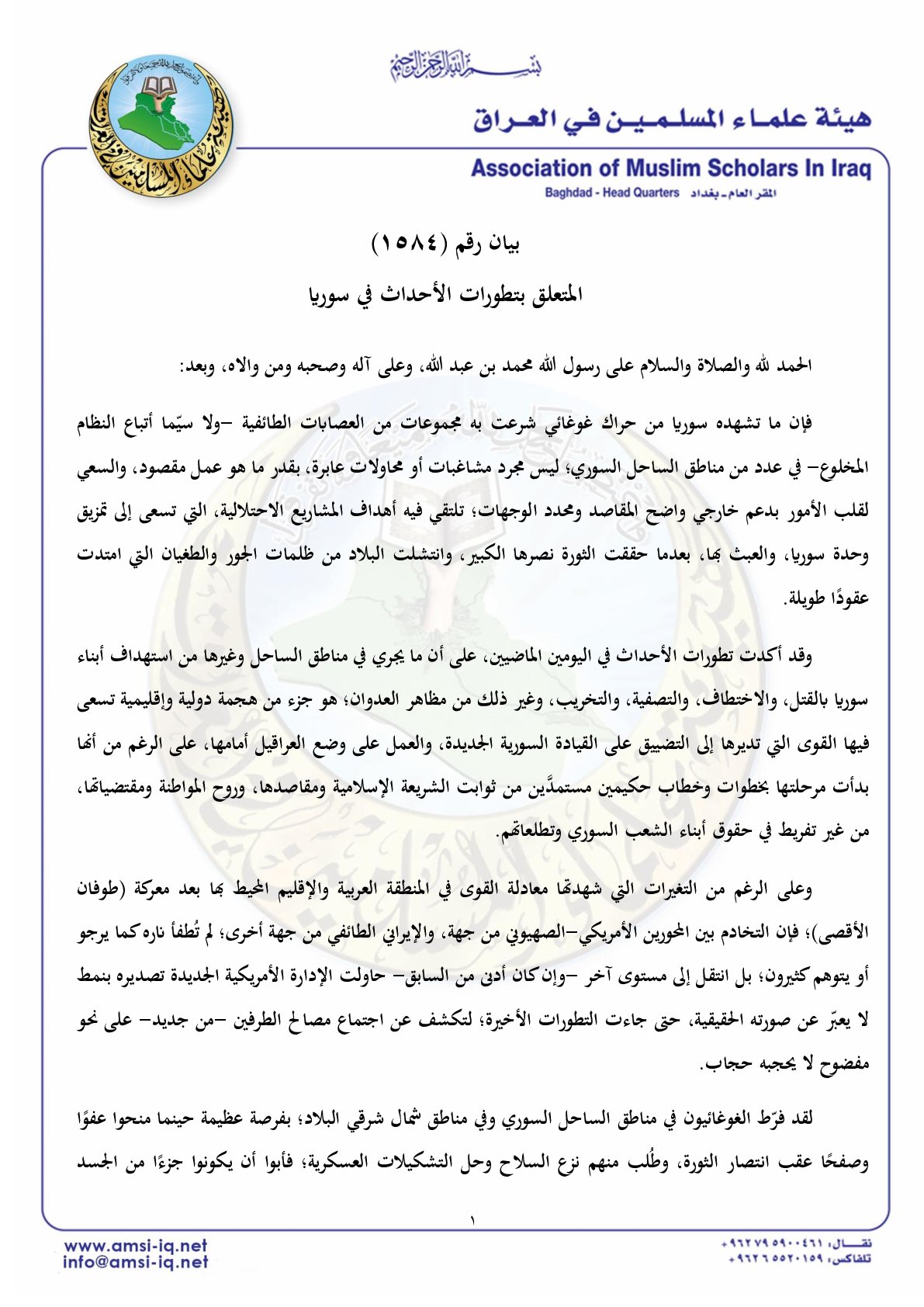هيئة علماء المسلمين في العراق: الغوغائيون في مناطق الساحل السوري وفي مناطق شمال شرقي البلاد أبوا أن يكونوا جزءًا من الجسد السوري بلونه الوطني وردائه التأريخي، ورضوا أن يصبحوا أدوات رخيصة تحرقها المشاريع الطائفية والعرقية.
