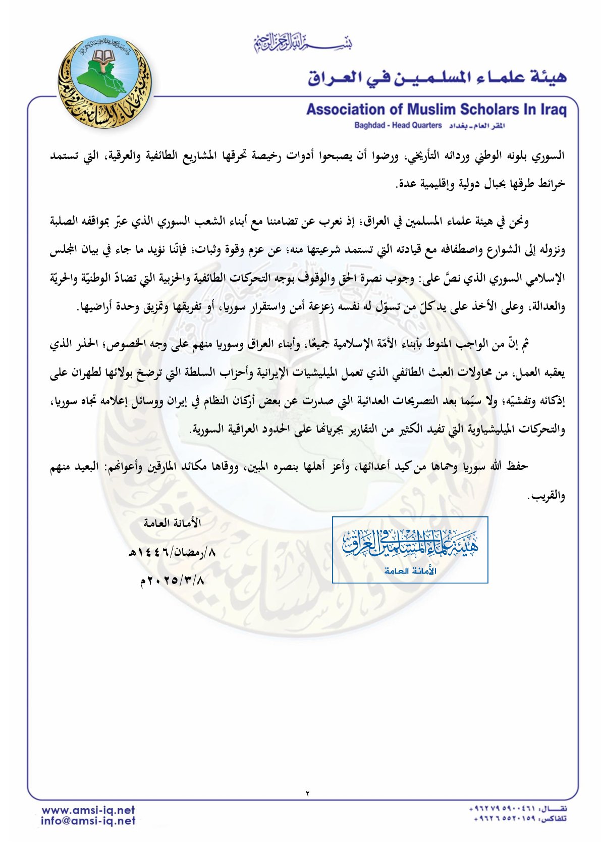 وانتهى البيان بالقول إن “من الواجب المنوط بأبناء الأمّة الإسلامية جميعًا، وأبناء العراق وسوريا منهم على وجه الخصوص؛ الحذر الذي يعقبه العمل، من محاولات العبث الطائفي الذي تعمل الميليشيات الإيرانية وأحزاب السلطة التي ترضخ بولائها لطهران على إذكائه وتفشيّه؛ ولا سيّما بعد التصريحات العدائية التي صدرت عن بعض أركان النظام في إيران ووسائل إعلامه تجاه سوريا، والتحركات الميليشياوية التي تفيد الكثير من التقارير بجريانها على الحدود العراقية السورية”.