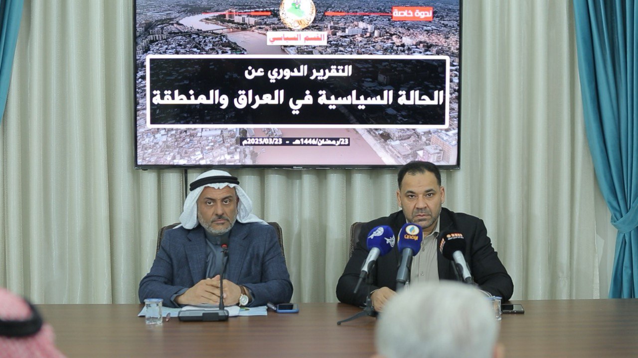 وسلطت الندوة خلال استعراض المحور العراقي في التقرير، الضوء على التحشيد الإعلامي والسياسي تجاه التغيرات الحاصلة في سوريا، وصولًا إلى الحراك الانتخابي المبكر، وما يحيط به من تنافس محموم.