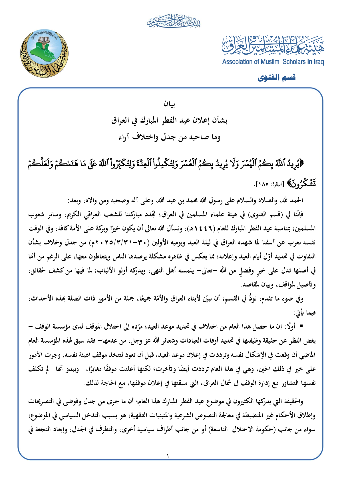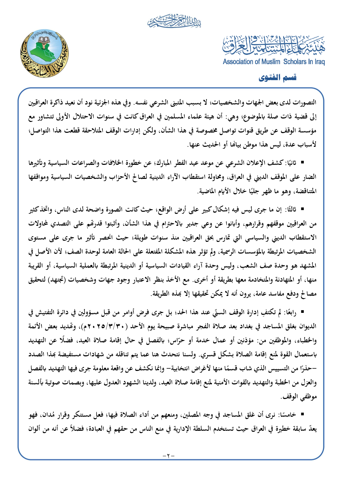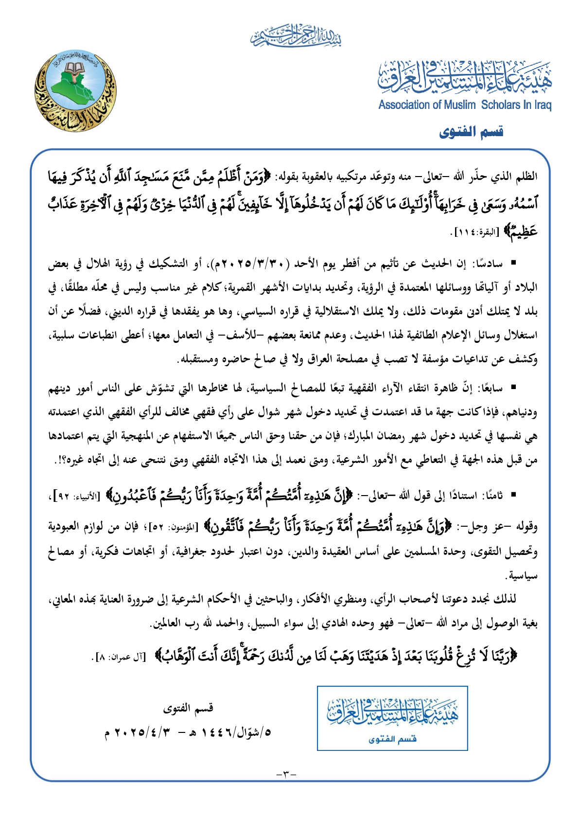 وأعرب قسم الفتوى في هيئة علماء المسلمين في العراق عن أسفه لما شهده العراق في ليلة العيد ويوميه الأولين (30-31 /3 /2025م) من جدل وخلاف بشأن التفاوت في تحديد أوّل أيام العيد وإعلانه، وهو ما ظهر جليًا خلال الأيام الماضية بعد إغلاق المساجد في وجه المصلين.