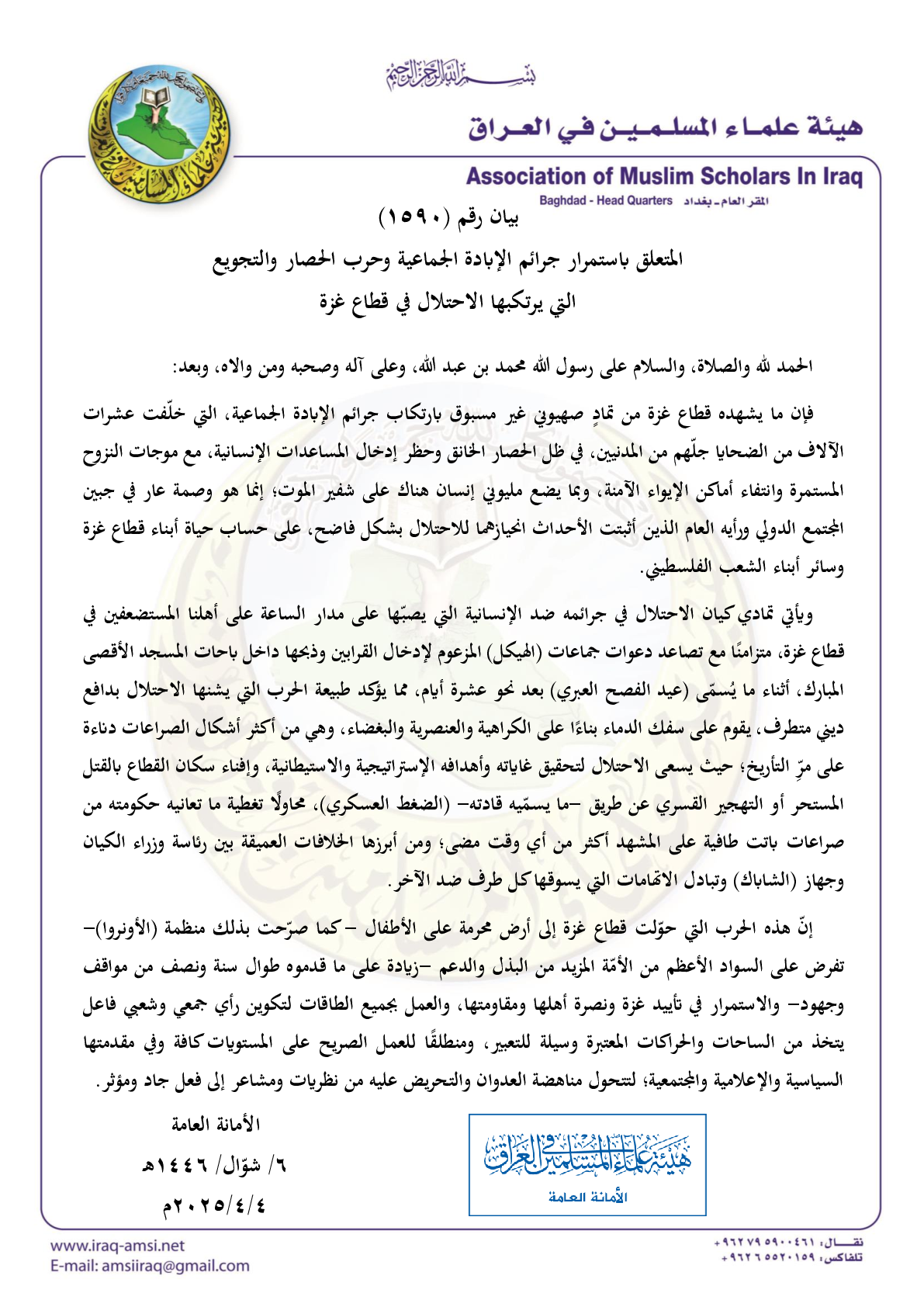 هيئة علماء المسلمين في العراق: جرائم الإبادة الجماعية في غزة وصمة عار في جبين المجتمع الدولي ورأيه العام الذين أثبتت الأحداث انحيازهما للاحتلال بشكل فاضح.