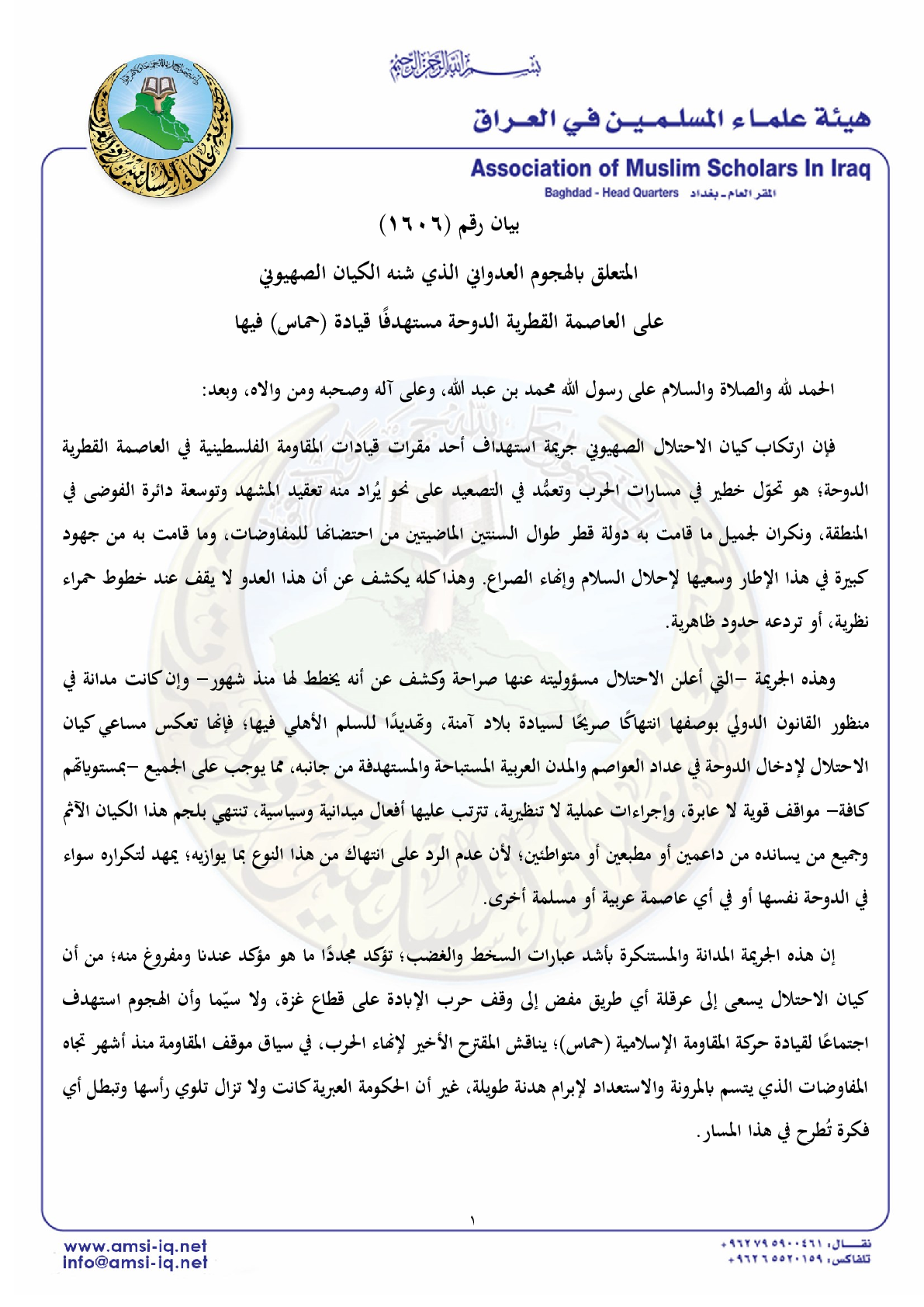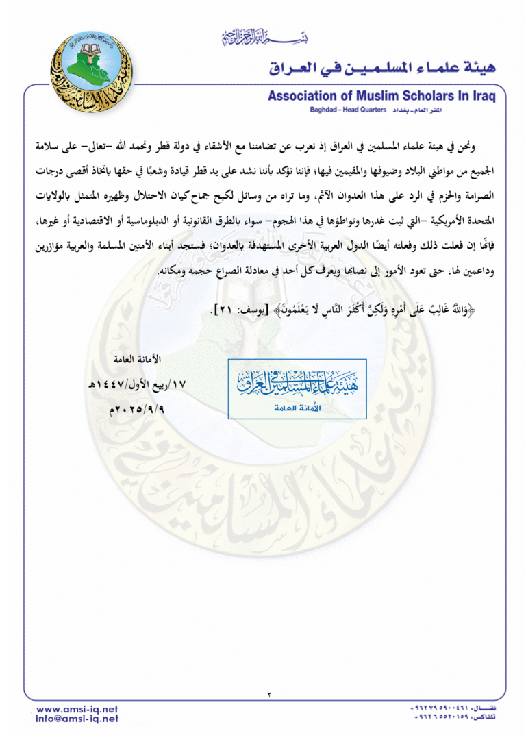 هيئة علماء المسلمين في العراق تؤكد تضامنها مع قطر قيادةً وشعبًا، وتأييد حقها الكامل في الرد على العدوان الصهيوني بكل الوسائل الممكنة.