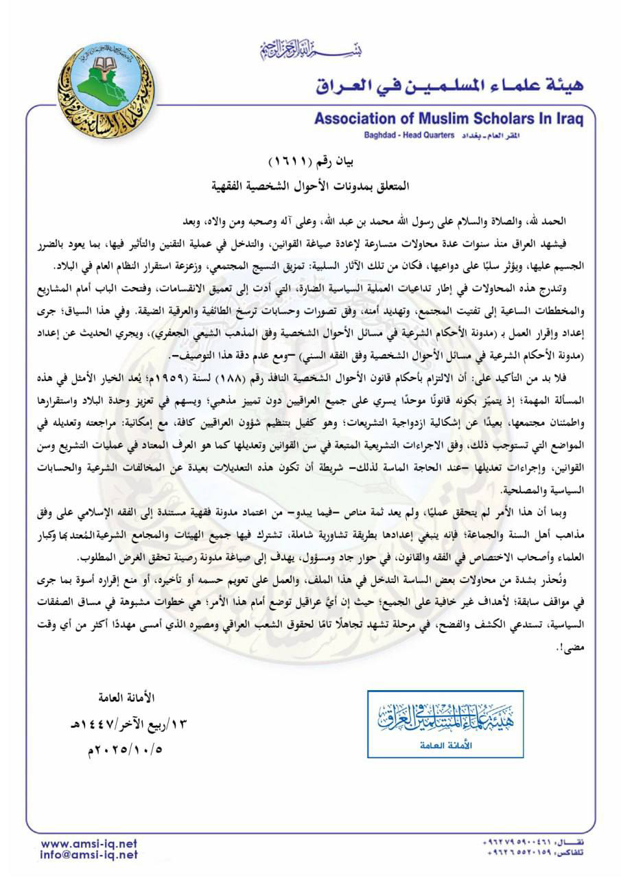 وأكدت هيئة علماء المسلمين في العراق أن قانون الأحوال الشخصية النافذ رقم (188) لسنة 1959 يبقى الخيار الأمثل لتنظيم شؤون المواطنين، بصفته قانونًا موحدًا يسري على جميع العراقيين دون تمييز مذهبي، ويسهم في تعزيز وحدة البلاد واستقرارها واطمئنان مجتمعها، بعيدًا عن إشكالية التعدد الطائفي في التشريع.