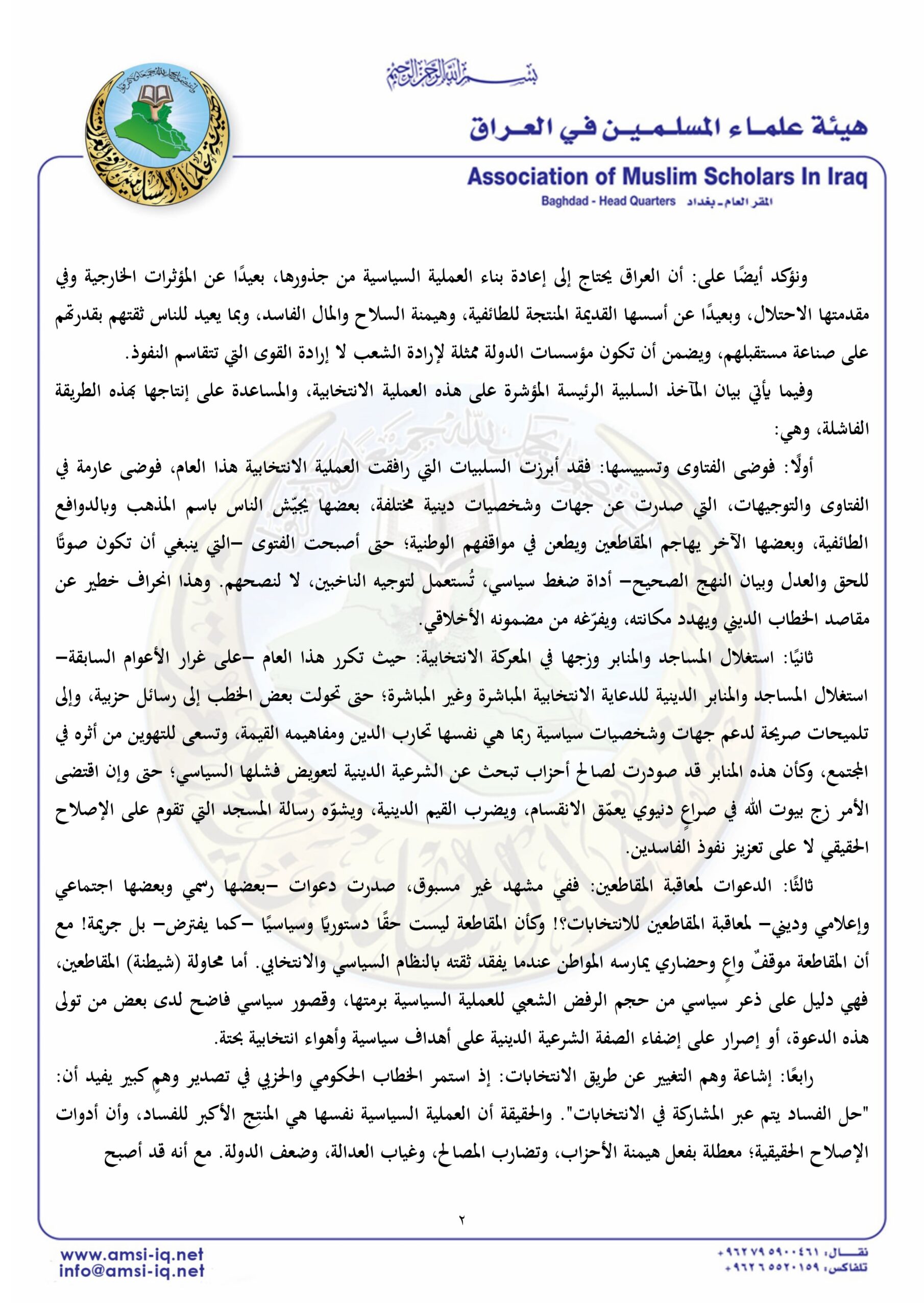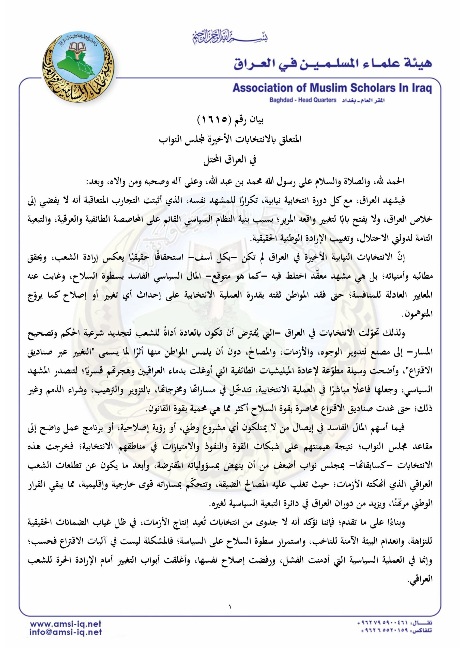وختمت هيئة علماء المسلمين بيانها بالتأكيد على أن الحل الحقيقي لا يكون بإحداث تحسينات شكلية على العملية السياسية، بل بإعادة بنائها على أسس سليمة تُقيم دولة المواطنة، وتُنهي نفوذ الطوائف والأحزاب والسلاح والمال الفاسد. وأكدت أن العراق «بأمسّ الحاجة إلى ولادة سياسية جديدة»، وإلى عقد وطني جامع يعبر عن إرادة الشعب، لا إلى دورة انتخابية جديدة تُعيد إنتاج الفشل ذاته.