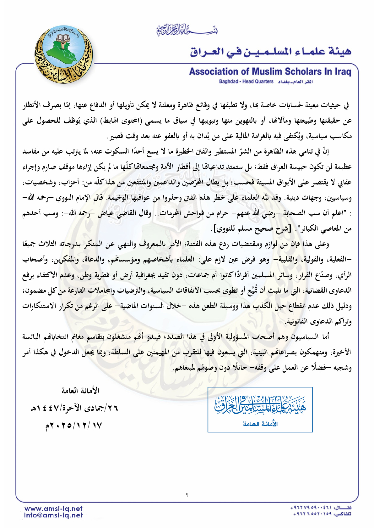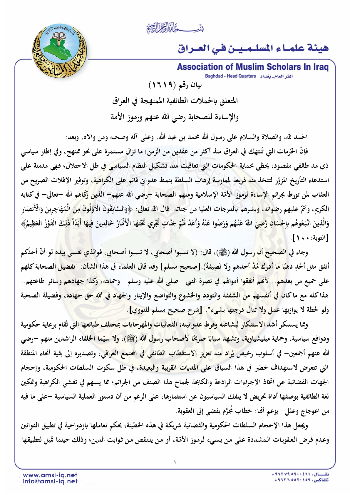 وأكدت الهيئة أن أخطر مظاهر هذا النهج يتمثل في الفعاليات والمهرجانات التي تُقام برعاية رسمية ودوافع سياسية، وتُؤمَّن بغطاء ميليشياوي، وتشهد سبابًا علنيًا لأصحاب رسول الله ﷺ، ولا سيما الخلفاء الراشدين رضي الله عنهم، معتبرةً أن هذه الممارسات تهدف إلى تكريس الاستقطاب الطائفي داخل العراق، وجرّ المنطقة بأسرها إلى دوائر فتنة مفتوحة، في ظل صمت حكومي واضح وتقصير قضائي فاضح.